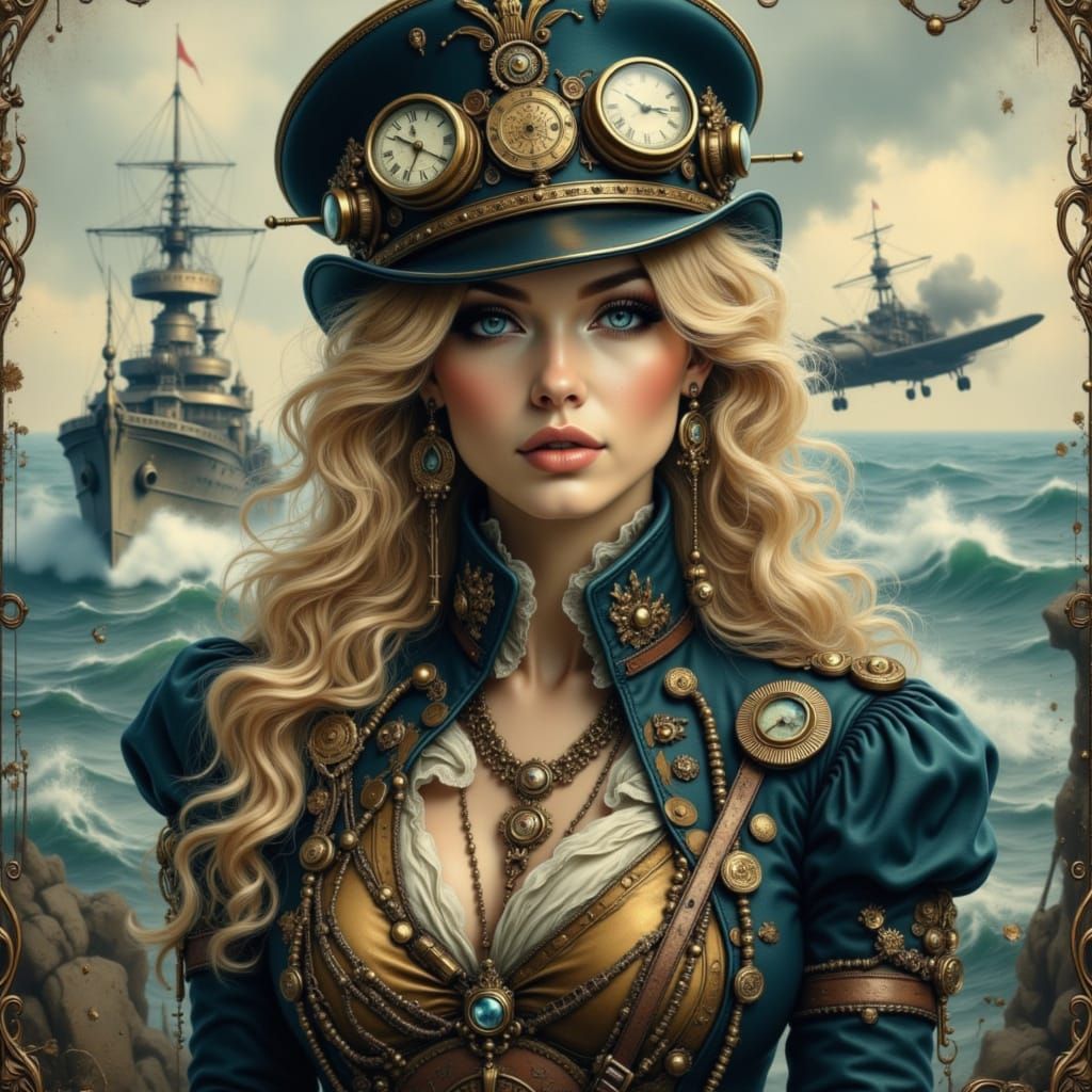 A regal woman with blonde wavy hair wears an ornate steampunk military uniform. The scene features a warship, vintage aircraft, and a fog-laden city in a dark fantasy steampunk aesthetic.
