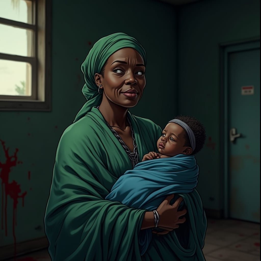 This image depicts a Nigerian woman holding a baby in a dilapidated, blood-stained room. The scene is rendered in a detailed anime horror style, with cinematic lighting and vibrant textures.