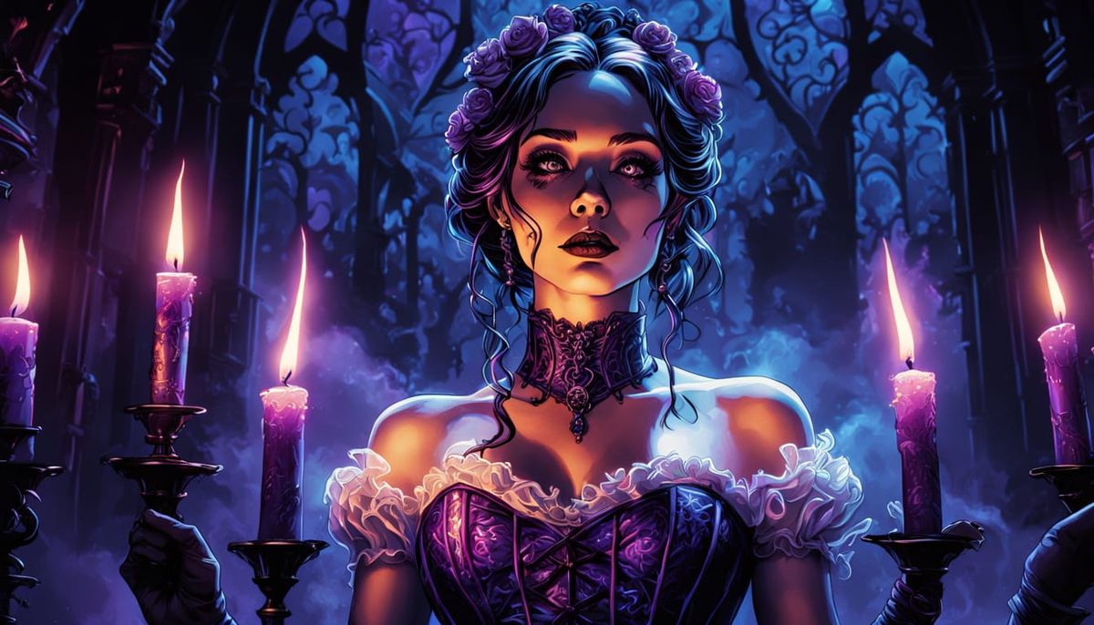 A striking picture of a bride in a purple corset, rendered in a gothic comic book style. The image features dark candles, swirling fog, dramatic lighting, and vibrant colors.