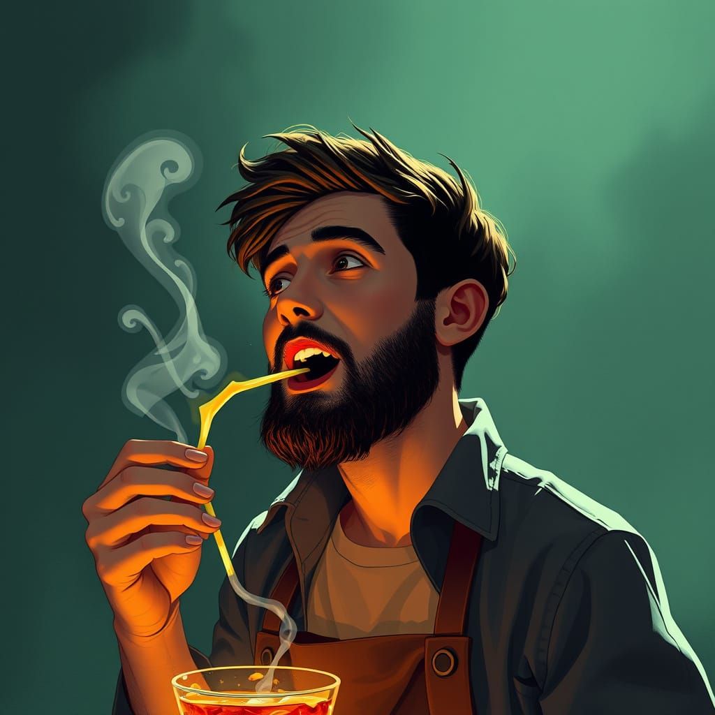 This image shows a close-up of a churro with cinnamon and sugar, bathed in warm light, next to a smiling mouth. It is styled as high-end gourmet confectionery art.