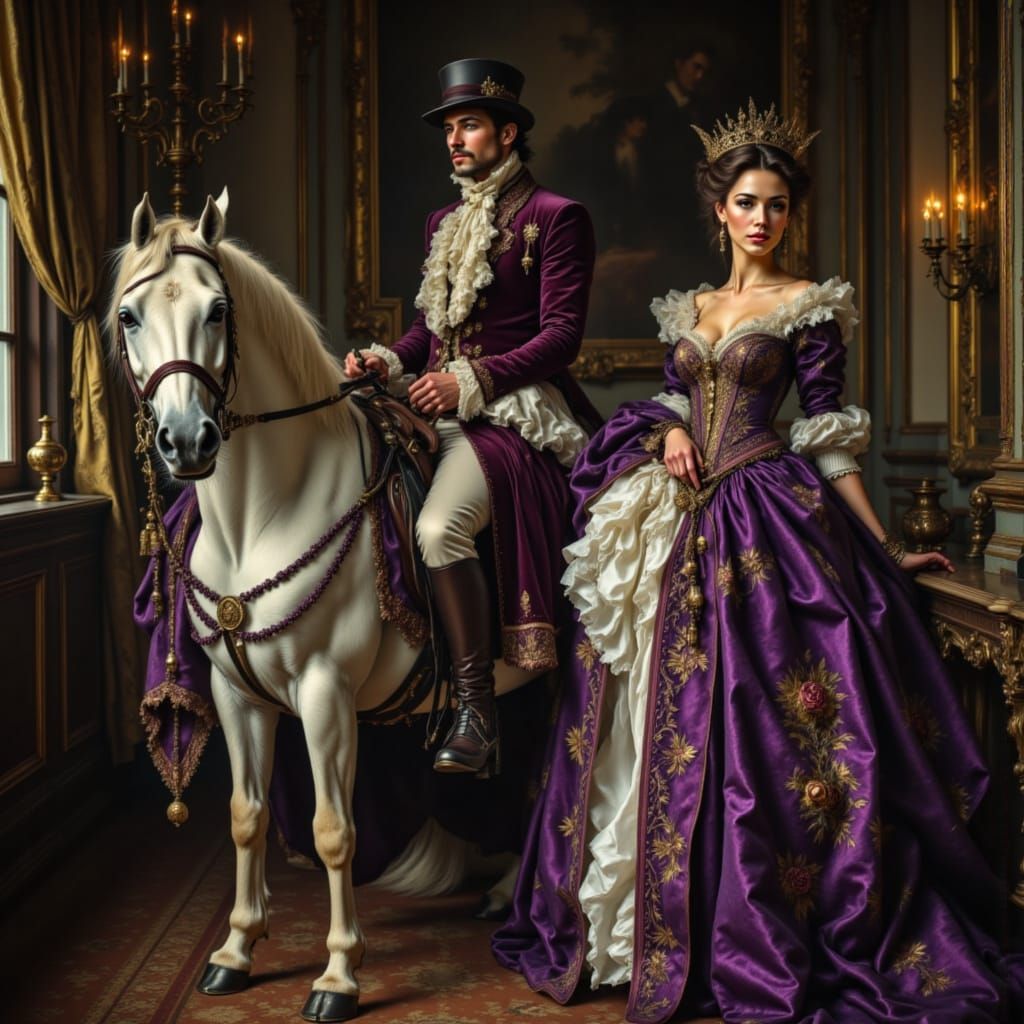 A majestic white horse adorned in ornate purple velvet tack, with a rider in an extravagant baroque gown, within a grand ballroom. Rendered in a dramatic baroque painting style with rich chiaroscuro lighting and opulent golden accents.