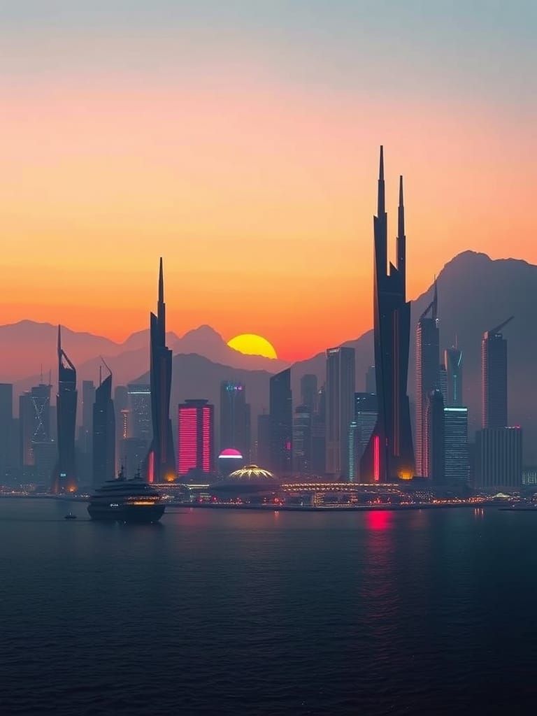 This image captures a futuristic cityscape at sunset, with sleek skyscrapers and neon lights reflecting off the calm ocean waters, set amidst a serene misty mountain range, blending industrial and biomechanical styles with a nostalgic and uneasy atmosphere.