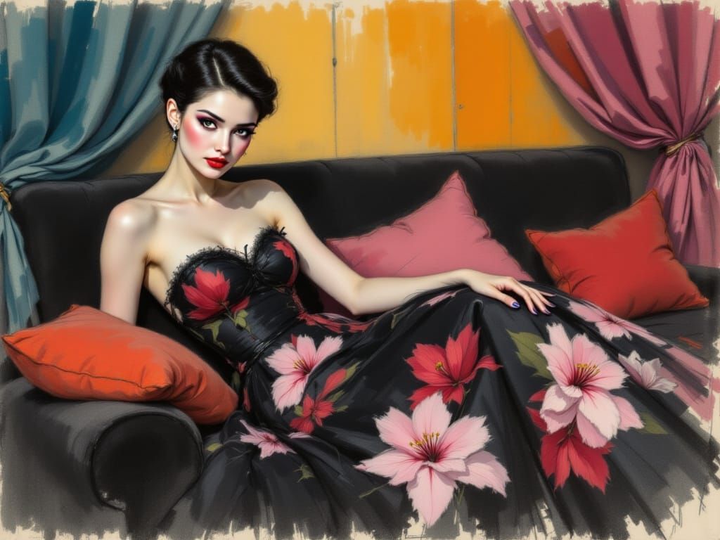 This image shows a chic woman reclining on a black couch, surrounded by vibrant, theatrical decor. Her elegant expression is the focal point amidst a bold, retro-modern backdrop of jewel-toned curtains and colorful tasseled pillows.