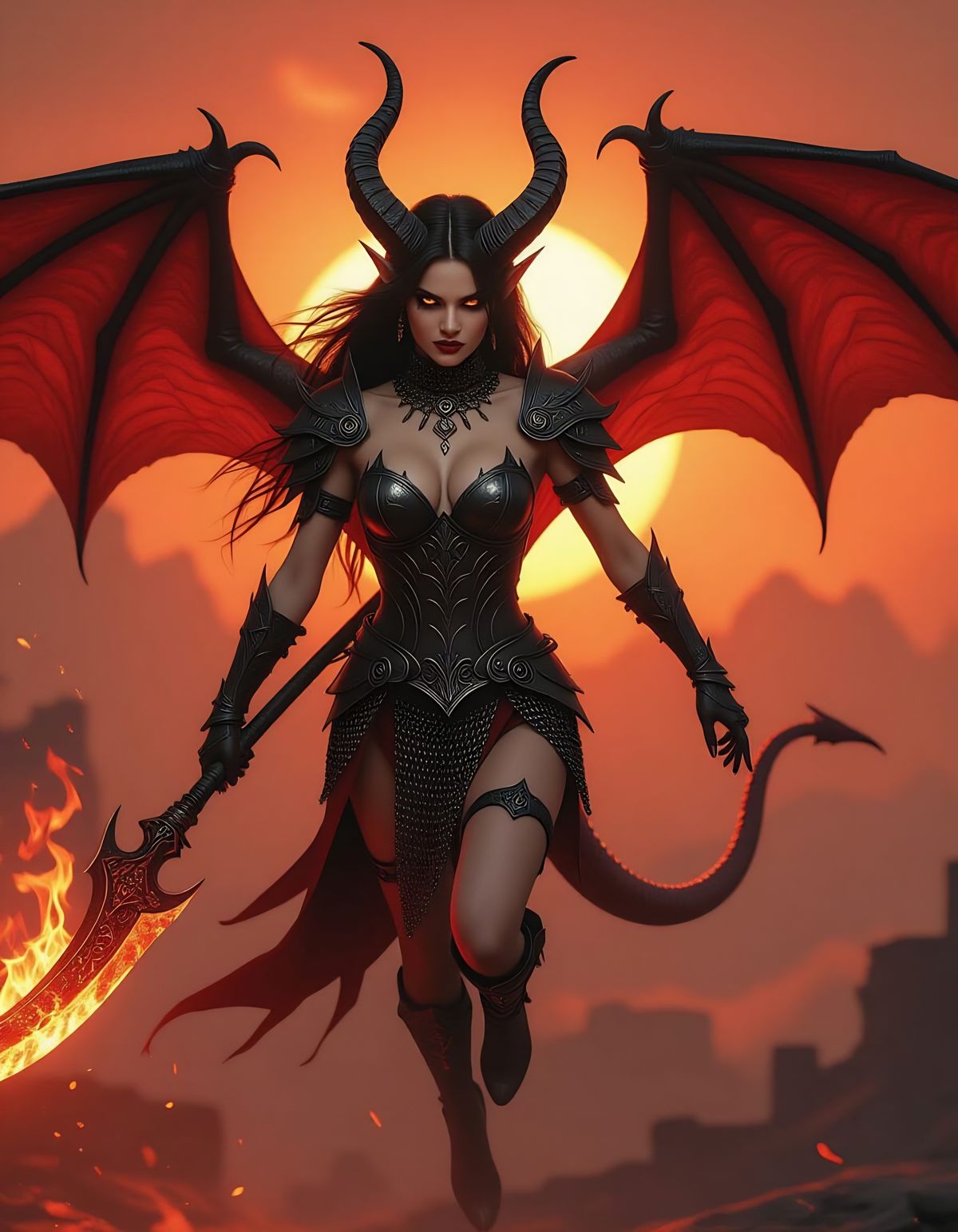 This image shows a photorealistic depiction of a winged demon in mid-flight against a foreboding, blood-red sky. She wields a flaming scythe and wears dark armor, captured with cinematic detail.