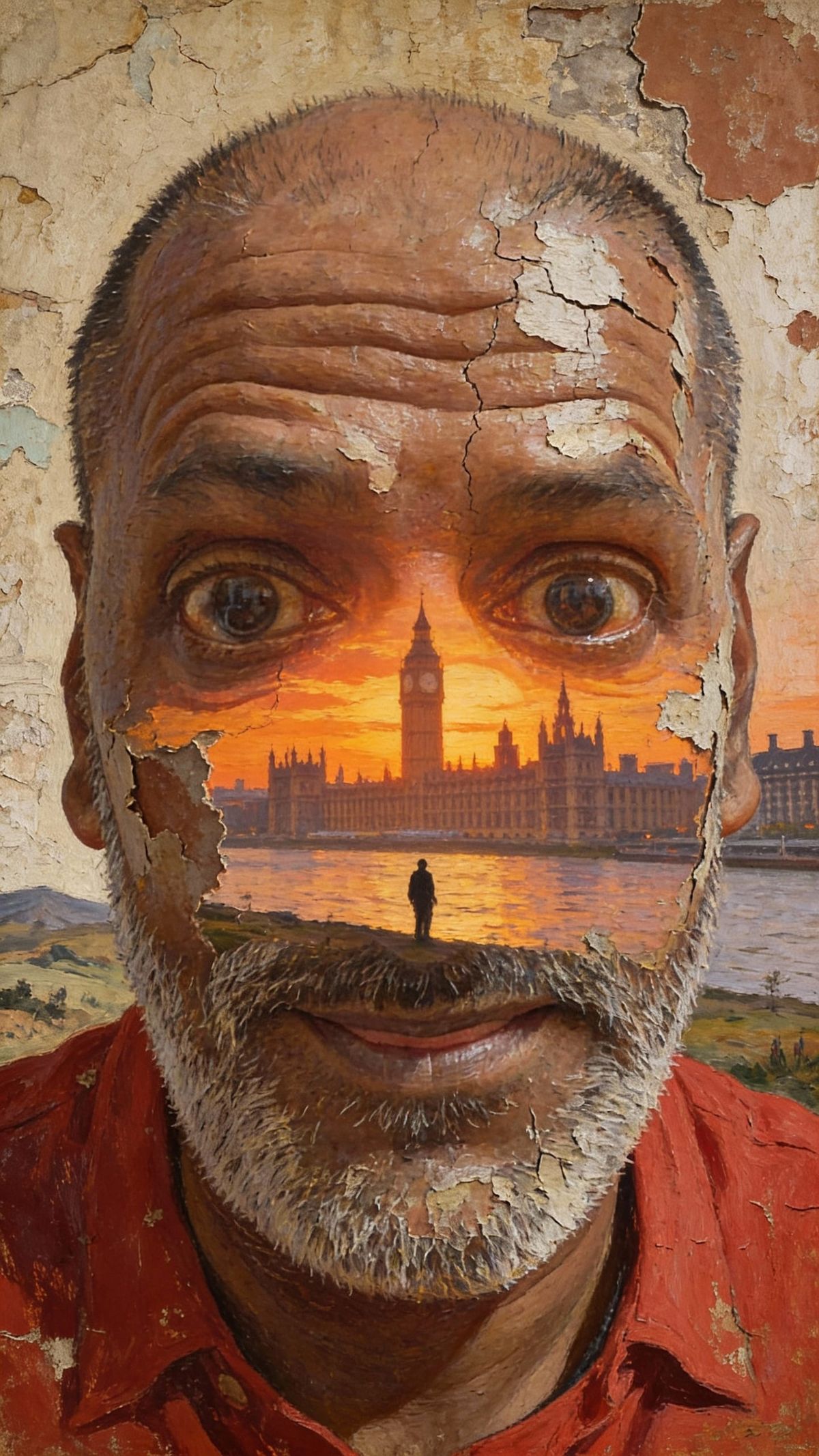 This image shows a hyper-detailed surreal portrait where a man's face blends with a decaying painting. Peeling paint reveals a London skyline sunset, with a mysterious figure by the water. Cracked textures evoke an aged mural.