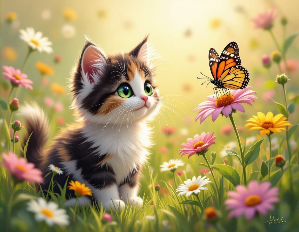 A digital rendering of a fluffy calico kitten with big green eyes in a wildflower garden, watching a butterfly. The image showcases a whimsical and dreamy aesthetic with bright colors.