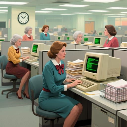 This digital matte painting showcases women in 1980s business attire working in cubicles with vintage computer terminals. The scene captures a brightly lit, bustling corporate environment with detailed rendering and atmospheric lighting.