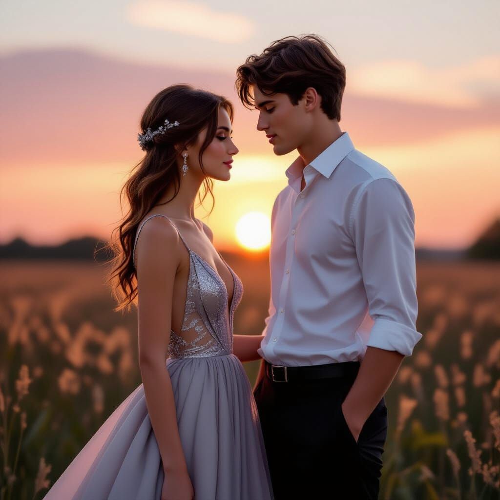 This image depicts a young couple embracing at sunset, their gazes locked in a romantic glow. Rendered in a soft, illustrative style with vivid colors and a dreamy atmosphere.