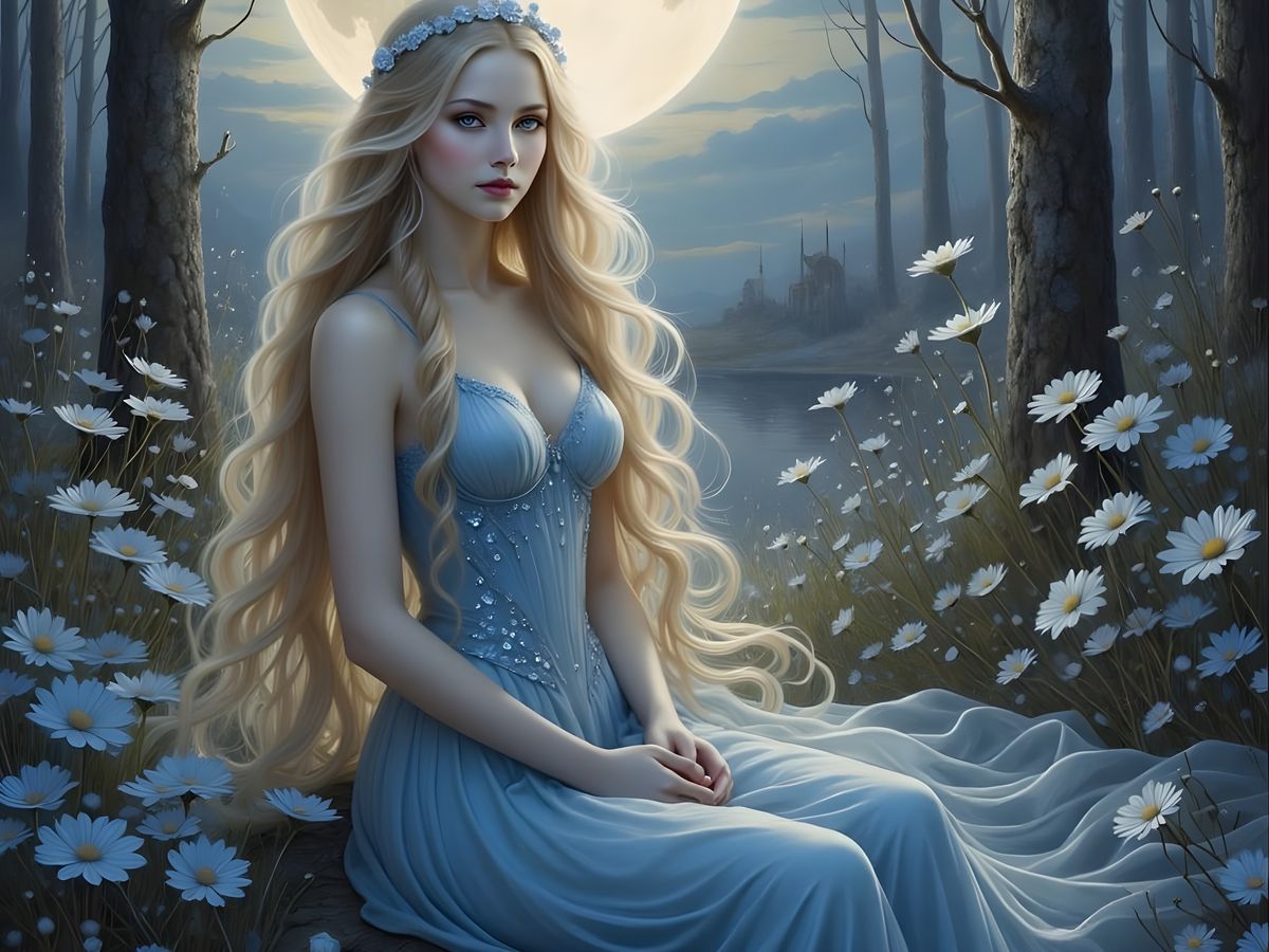 A hauntingly beautiful Norse goddess sits in a dimly lit, dark night scene, her long braided blonde hair and sapphire blue eyes illuminated by the waxing moon. Created in a fine art, low-contrast style reminiscent of gothic masterpieces.