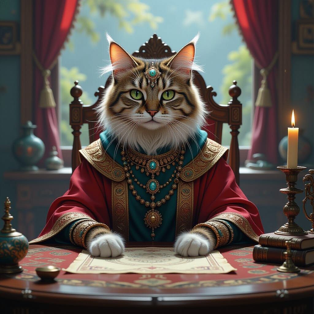 A captivating image of a fortune-telling cat dressed in robes and jewelry at an antique table. Mystical objects surround the cat, rendered with whimsical and futuristic digital art styles.