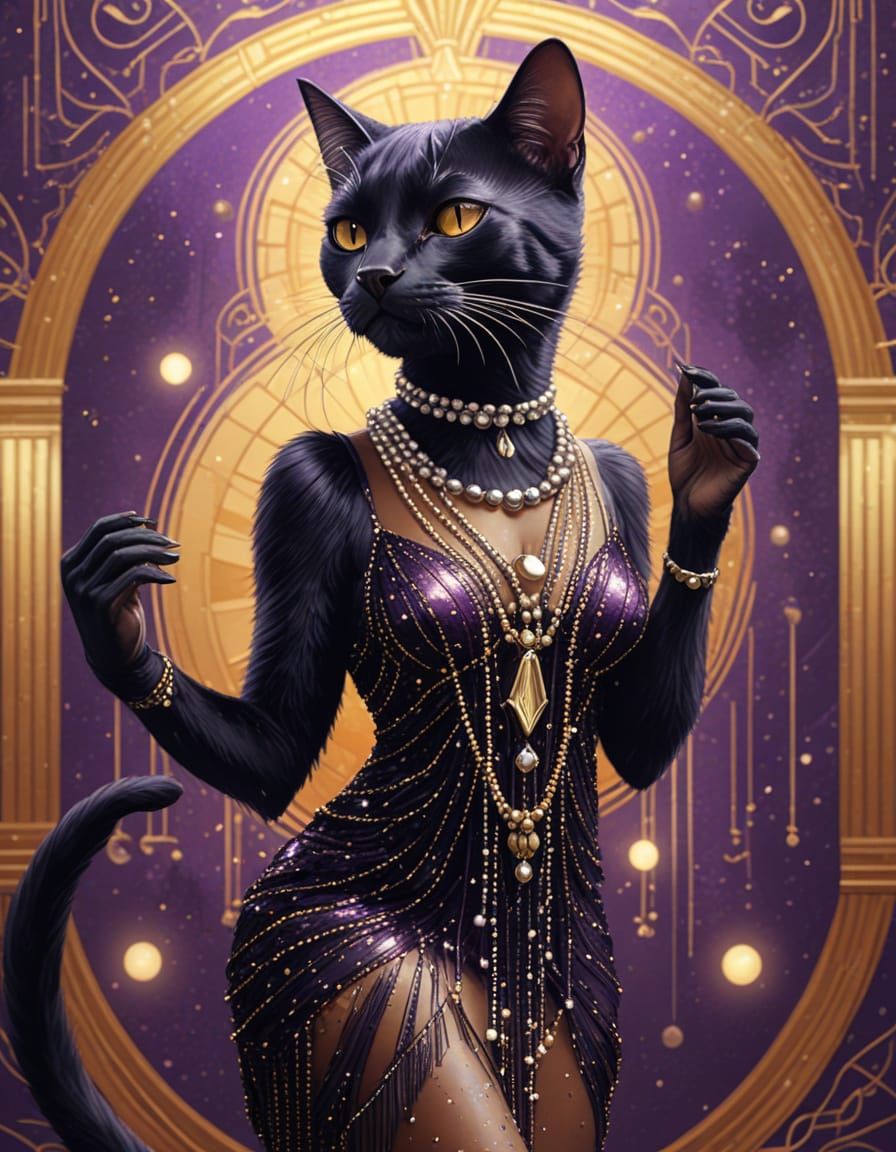 A roaring twenties art deco poster of a full-length black cat in a flapper dress singing. This digital painting features shimmering textures, glowing pearls and a holographic background in deep purple and gold.
