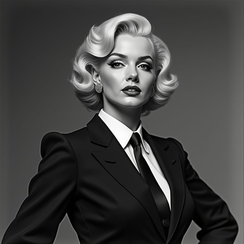 This image showcases a stylish fusion of femininity and menswear, blending a classic Hollywood starlet's charm with a masculine twist.
