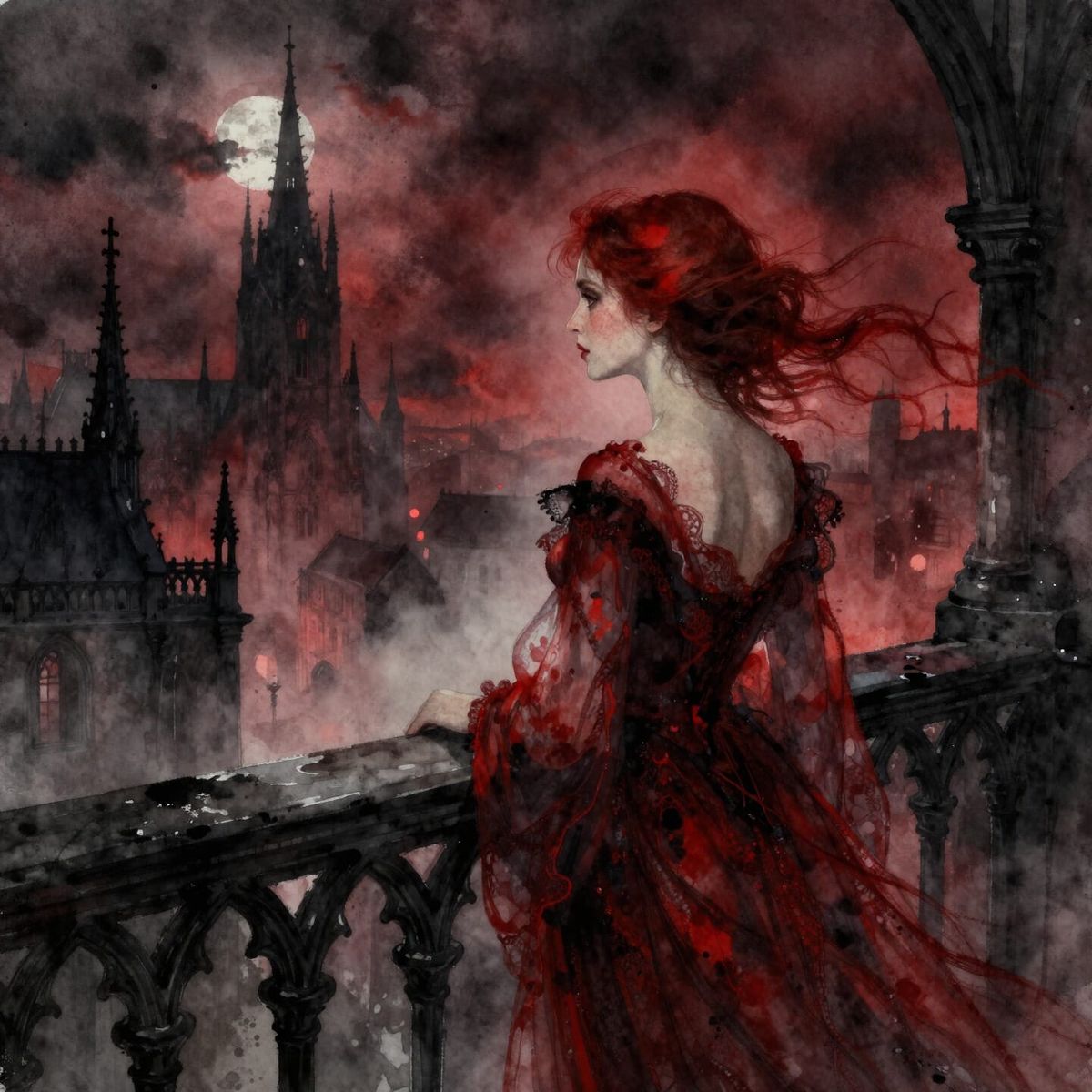 A gothic watercolour illustration of a woman in deep red and black tones, leaning on a balcony and observing a historic city at night. Features soft washes and paper texture.