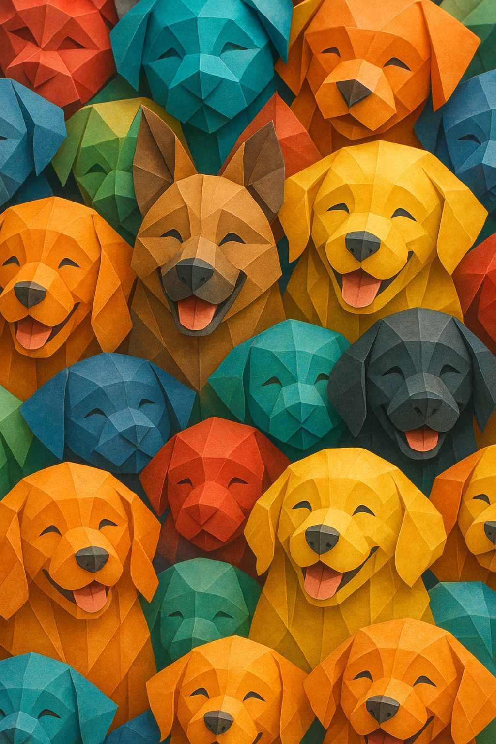 This image displays a hyperrealistic group photo of cute, smiling puppies made from colorful folded origami paper. The detailed papercraft features German Shepherds, Golden Retrievers, and Cocker Spaniels filling the frame.