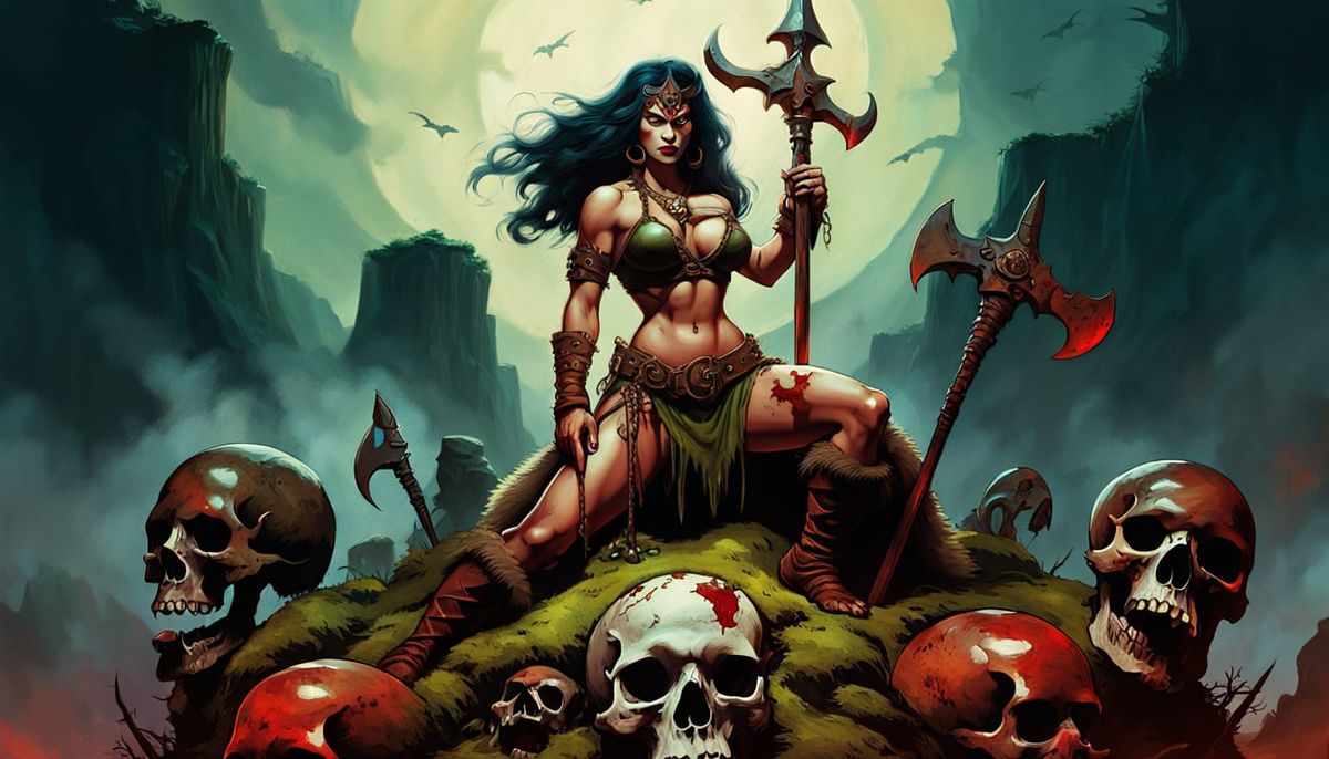 A striking picture of a muscular barbarian queen standing on a skull. She has fiery white hair, wears fur-lined leather, and her red eyes gleam. The image captures a fantasy horror landscape with a heavy metal aesthetic.