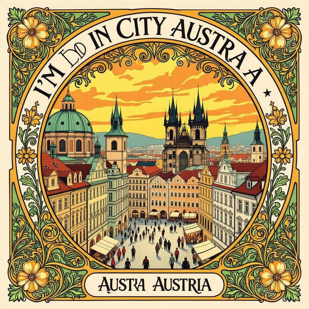 This image showcases a lively Austrian city scene with elegant architecture, rendered in a decorative Art Nouveau style. Golden hour light enhances the intricate floral motifs and organic lines, evoking adventure and urban connection.