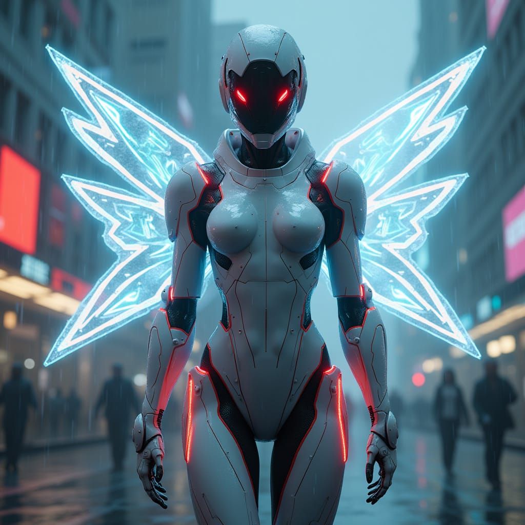 A hyper-realistic depiction of a cyborg warrior in white armor with red neon accents, standing in a rainy, neon-lit city with holographic billboards.