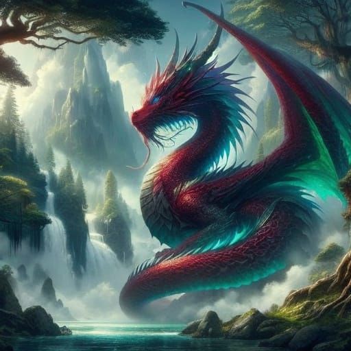 This image shows a majestic red dragon amidst a misty mountainous backdrop, its iridescent green scales glistening in the mystical atmosphere, reminiscent of a fantasy world