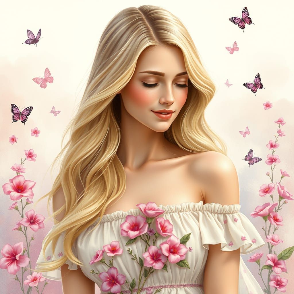 This image shows a beautiful young woman with long blond hair in a floral off-shoulder dress, smiling gently against a soft, dreamy watercolor background. Rendered with realistic detail and soft lighting.