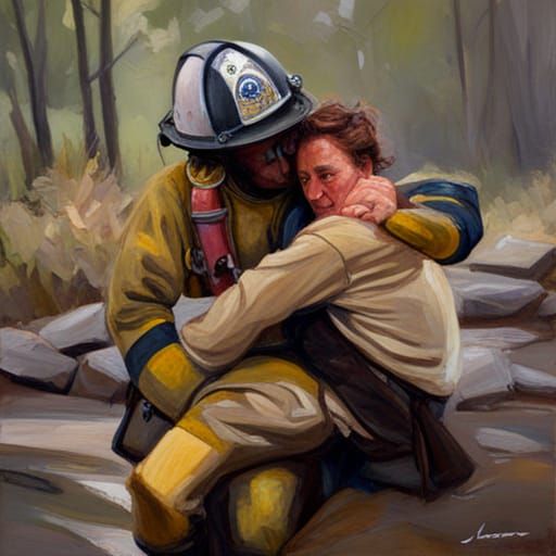 A touching image of a firefighter embracing a rescued person. The scene is evocative of oil paintings with realistic figures and dramatic lighting.