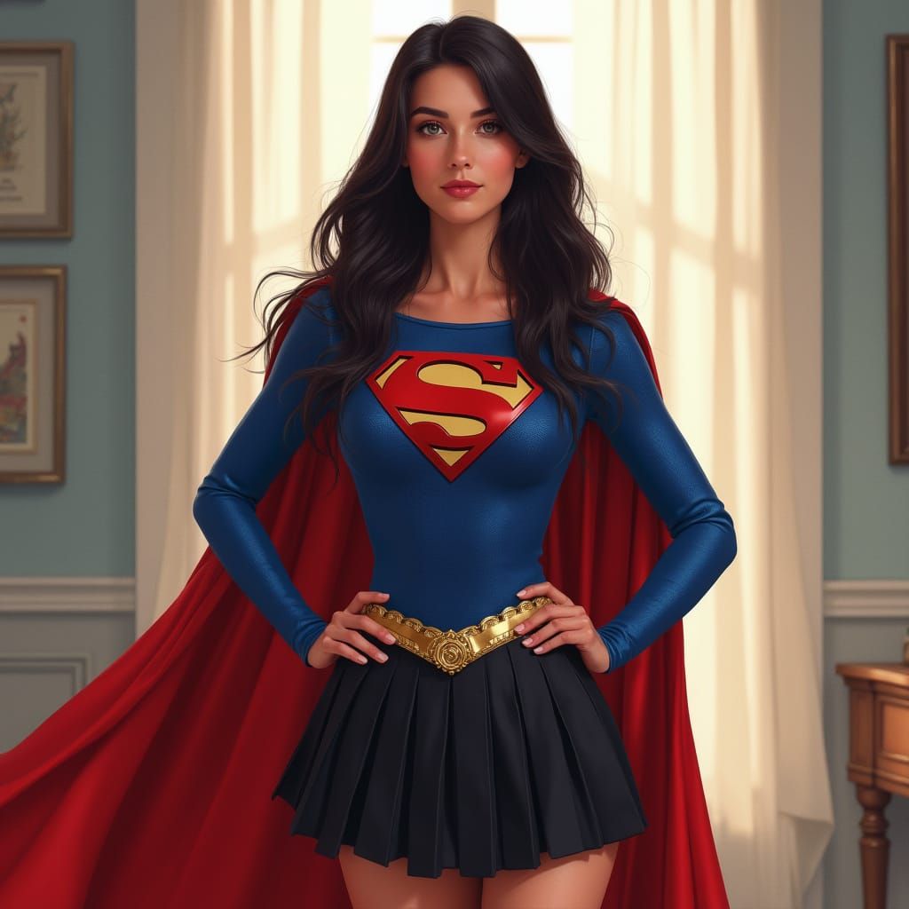 This image shows a young woman in a Supergirl-inspired outfit standing confidently in a sunlit room. The image blends realism with vibrant colors, reminiscent of digital painting styles.