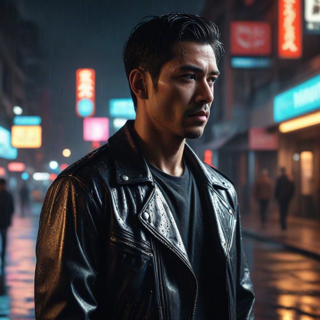 A close-up portrait of a rugged man standing on a wet pavement, illuminated by vibrant neon lights and dramatic shadows, set against a blurred Asian cityscape.