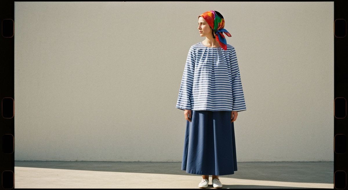 This image shows a modestly dressed Haredi Jewish woman in traditional attire. She is wearing a colorful headscarf and a striped blouse, captured with soft lighting in a cinematic style.