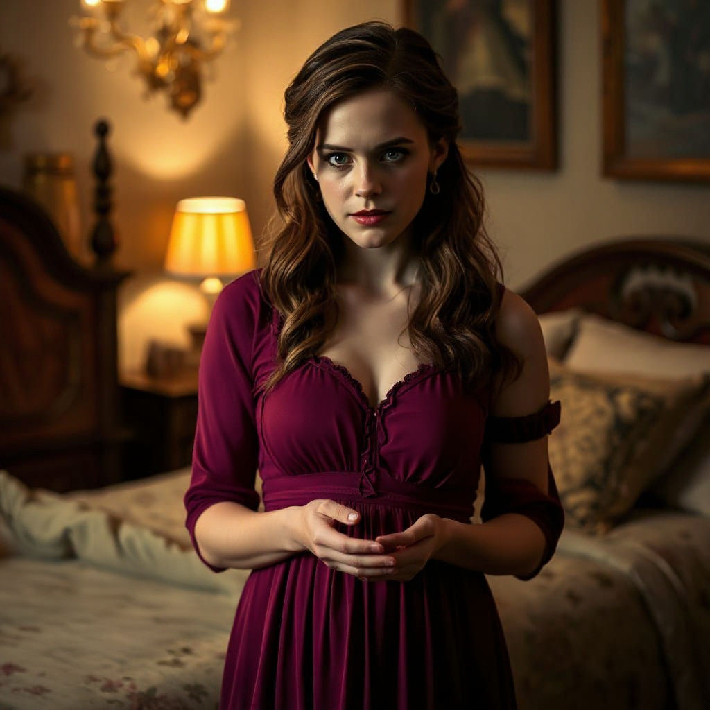 This image depicts a realistic photo of Hermione Granger holding a potion. The scene is set at night in a bedroom, with Hermione wearing a nightgown.