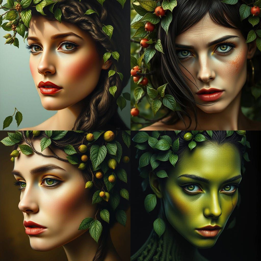 This image depicts a stunning fusion of human and natural elements, with a woman's face blending seamlessly into a tree-like structure. Her skin has a tree bark texture, with intricate cracks and a palette of earthy tones. Her eyes gleam with an hypnotic intensity, while her hair is composed of roots and...