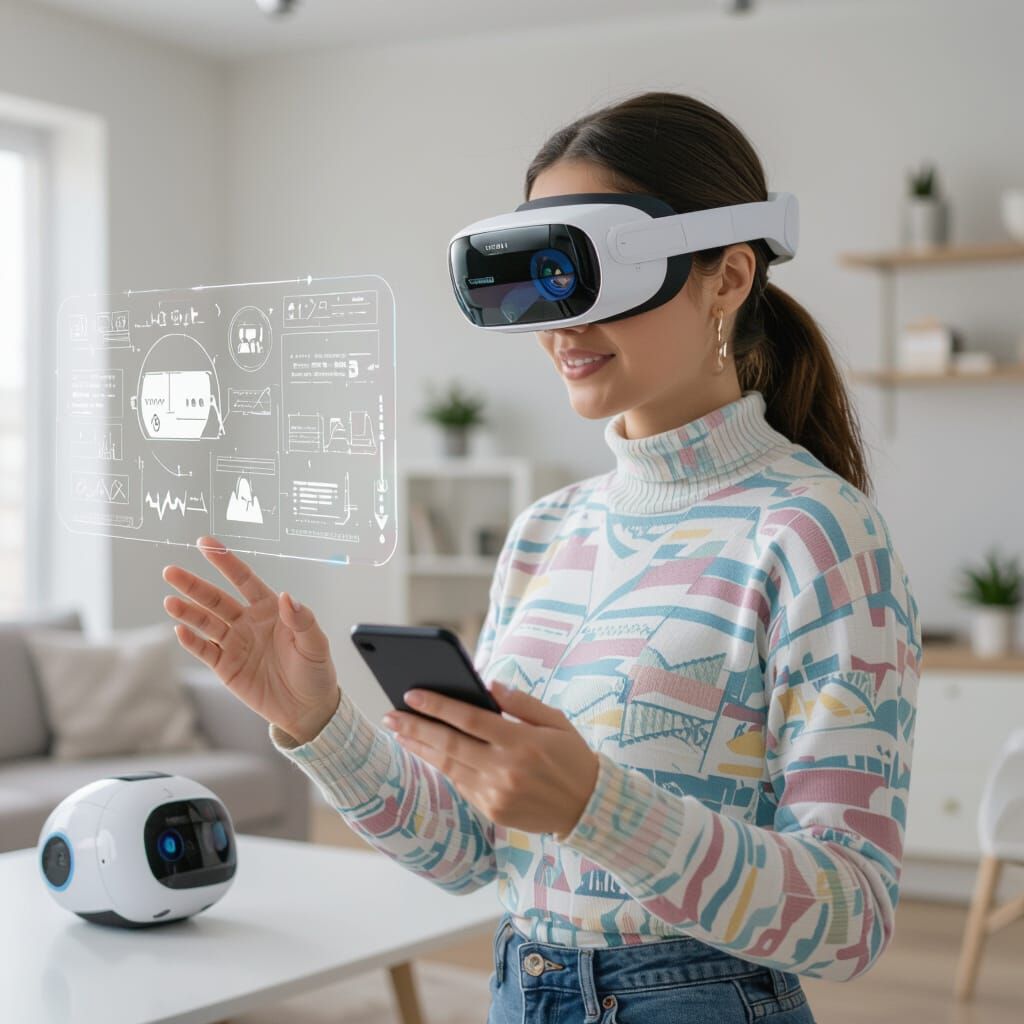 A woman uses augmented reality glasses and a smartphone to interact with an AI assistant in a contemporary home setting, featuring a blend of science fiction and minimalist design.
