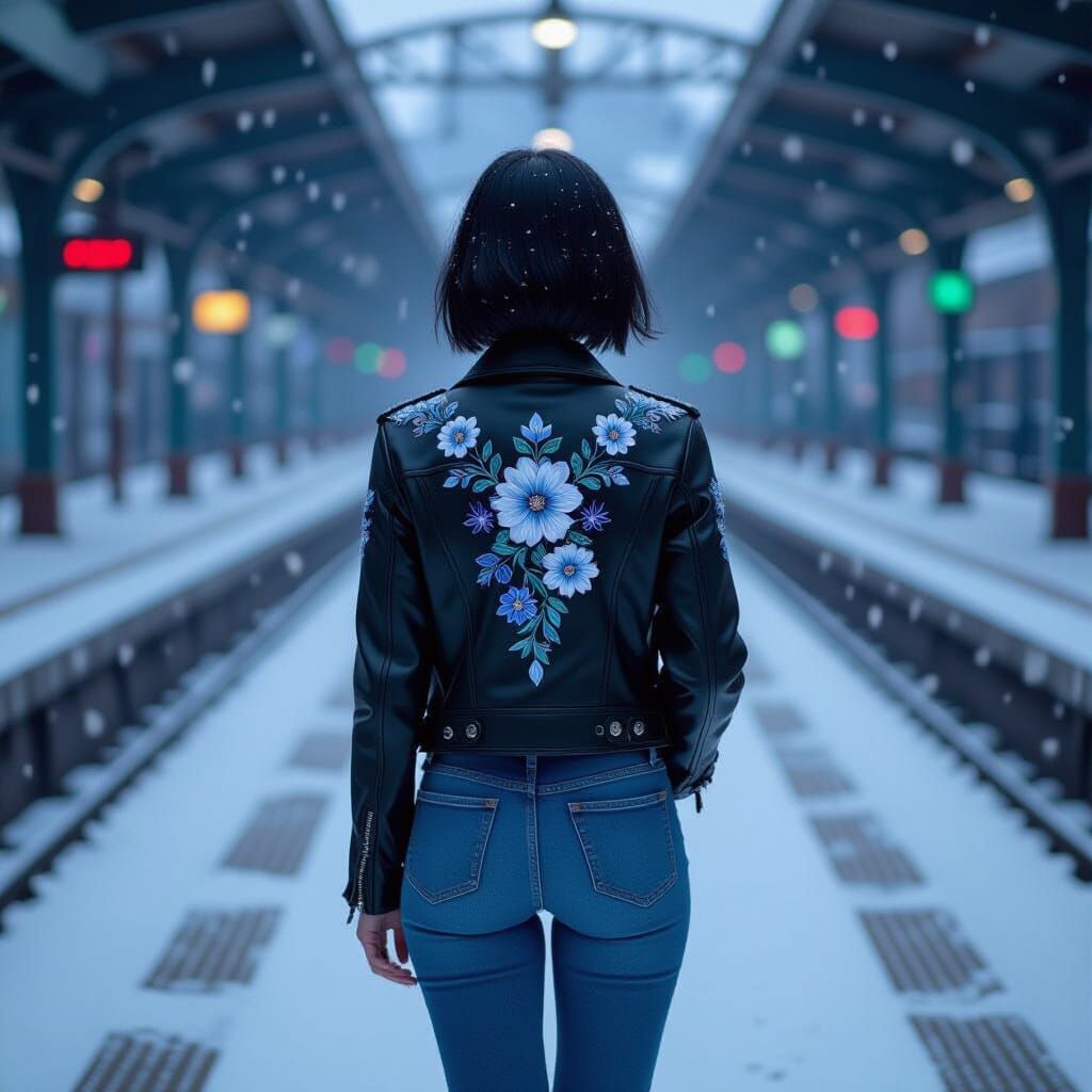 A woman with a black buzz cut stands on a deserted train platform as snow falls. She wears a black leather jacket with floral embroidery and blue jeans, rendered in a vibrant anime style.