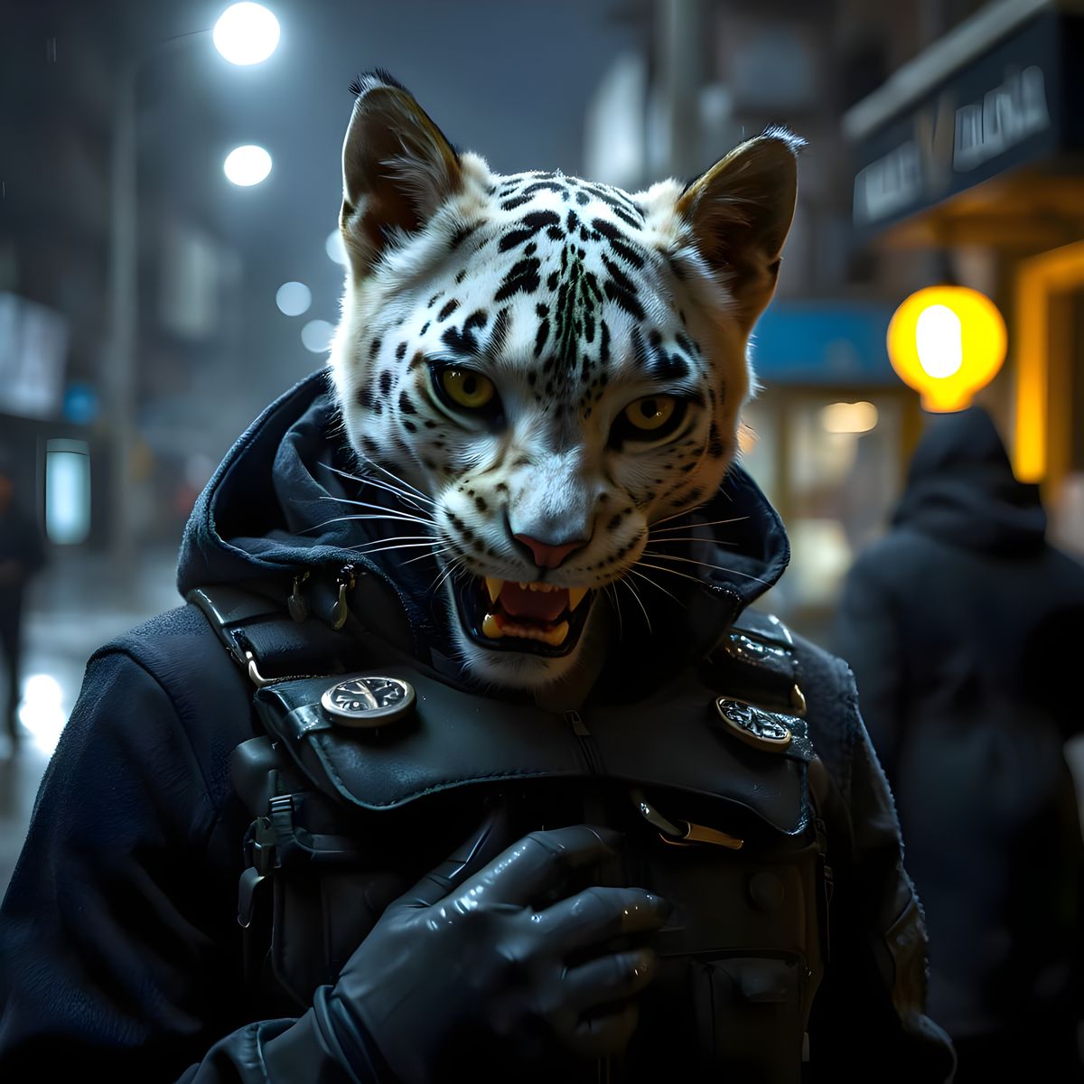 This hyperrealistic image shows a fierce snow leopard vampire soldier in military gear, displaying glowing eyes and sharp claws in a rain-soaked favela at night. Cinematic and atmospheric.
