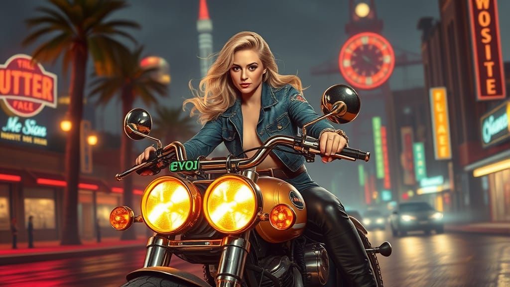 A striking picture of a blonde woman riding a steam-powered motorcycle through a retro-futuristic cityscape at night. The image blends cinematic realism with vintage sci-fi aesthetics in a dieselpunk style.