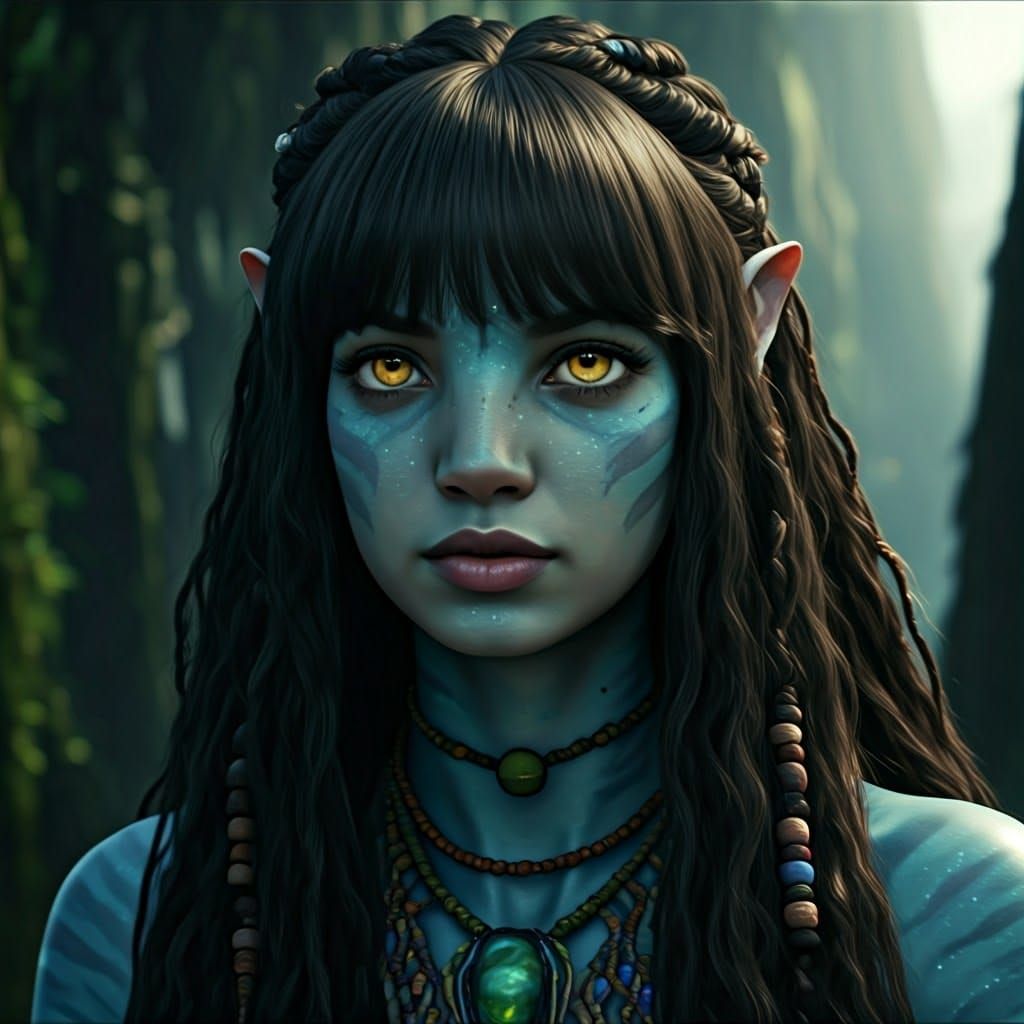 This striking image depicts a mystical Navi, channeling the essence of Pandora's lush world, with untamed black hair adorned with beads and gold eyes shining with otherworldly intensity. Shot in a 35mm film aesthetic, this cinematic still exudes grandeur and drama, reminiscent of James Cameron's epic wor...