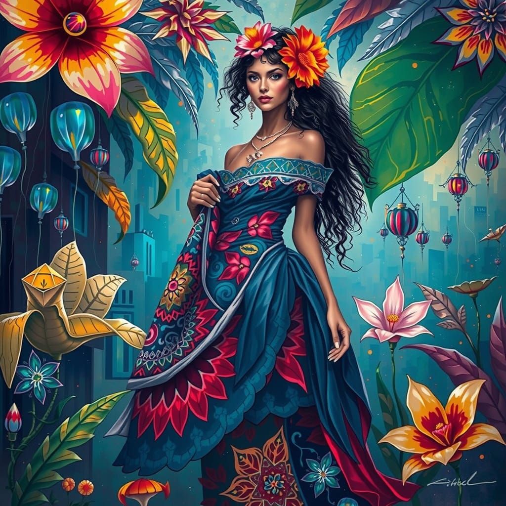 This image depicts a woman standing alone in a vibrant, surreal cityscape, surrounded by dynamic geometric patterns and abstract shapes, blending elements of cubism and digital art in a futuristic aesthetic