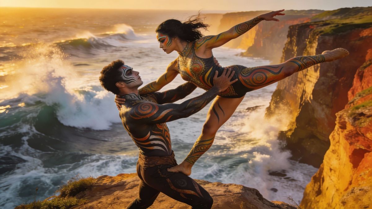 This photorealistic image captures a couple performing an intense dance on a cliff, with dramatic waves below and golden hour light. Features intricate body paint and dynamic poses.