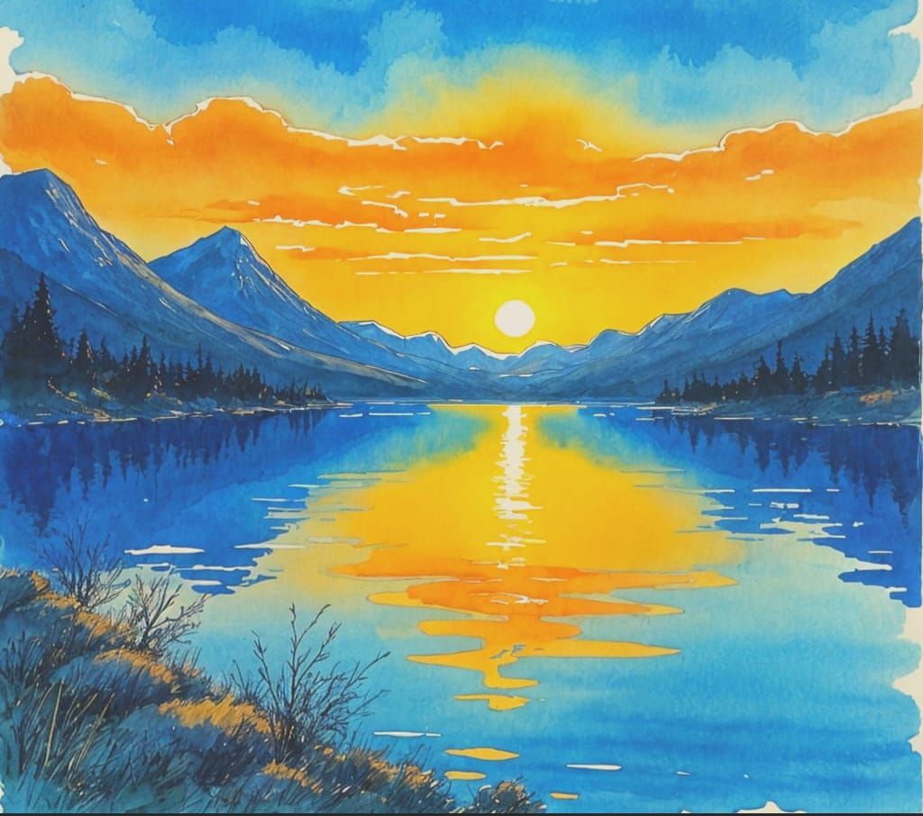 A vibrant vista of a still blue lake at sunrise. The artwork evokes modern ink drawing techniques, resembling alcohol ink art with an abstract aesthetic.