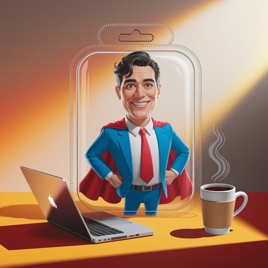 This playful image shows a cartoon office superhero in a plastic blister pack, surrounded by humorous spoof-gear and a warm, sunny background.