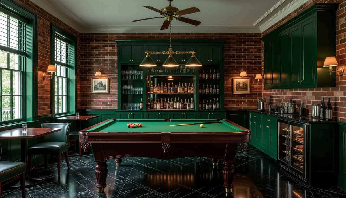 This image showcases a richly detailed, opulent Victorian billiards room. It features a vibrant green baize table, dark green cabinets, a Smeg fridge, and polished black marble floors, illuminated with moody, chiaroscuro lighting.