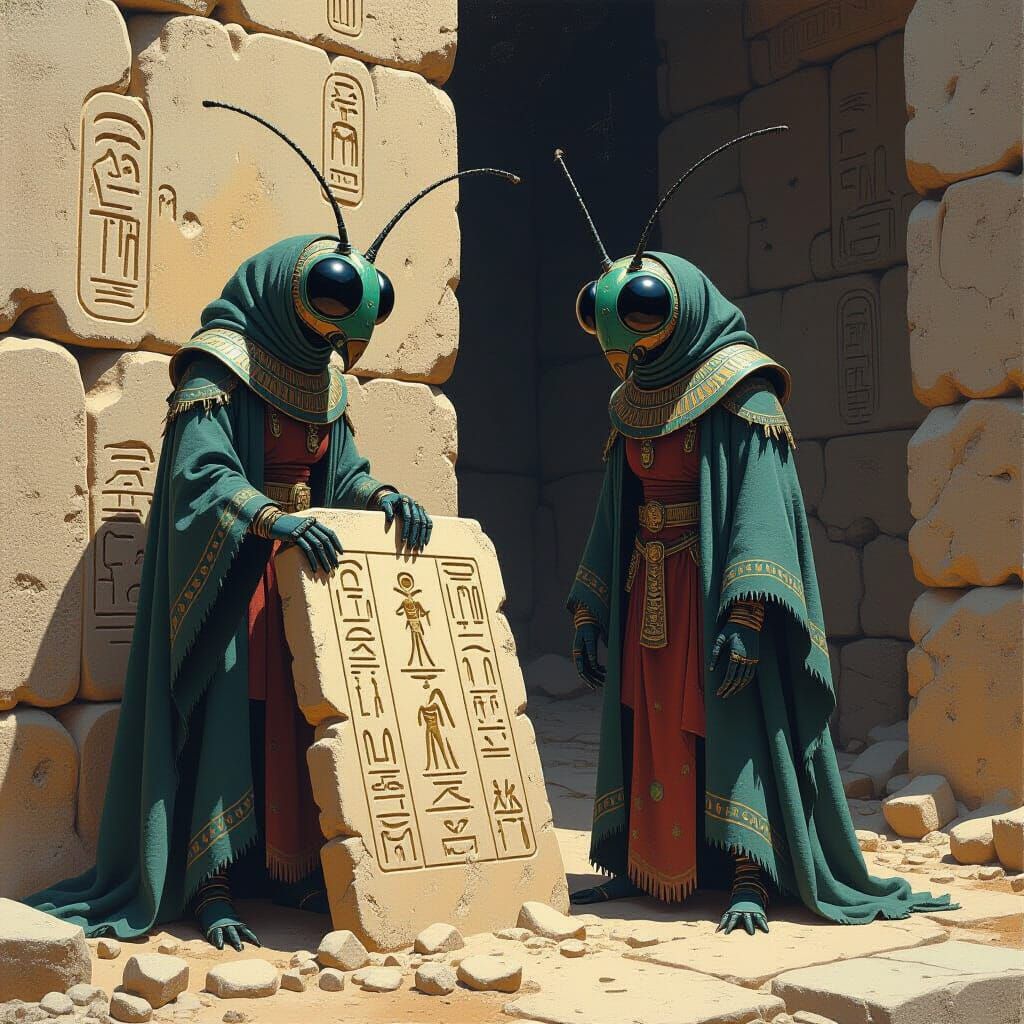 Two large insectoid creatures with elongated bodies, large compound eyes, and multiple limbs are standing in front of an ancient stone tablet inscribed with hieroglyphics. The creatures are facing the tablet, with their bodies slightly turned to the left. They appear to be examining or interacting with ...