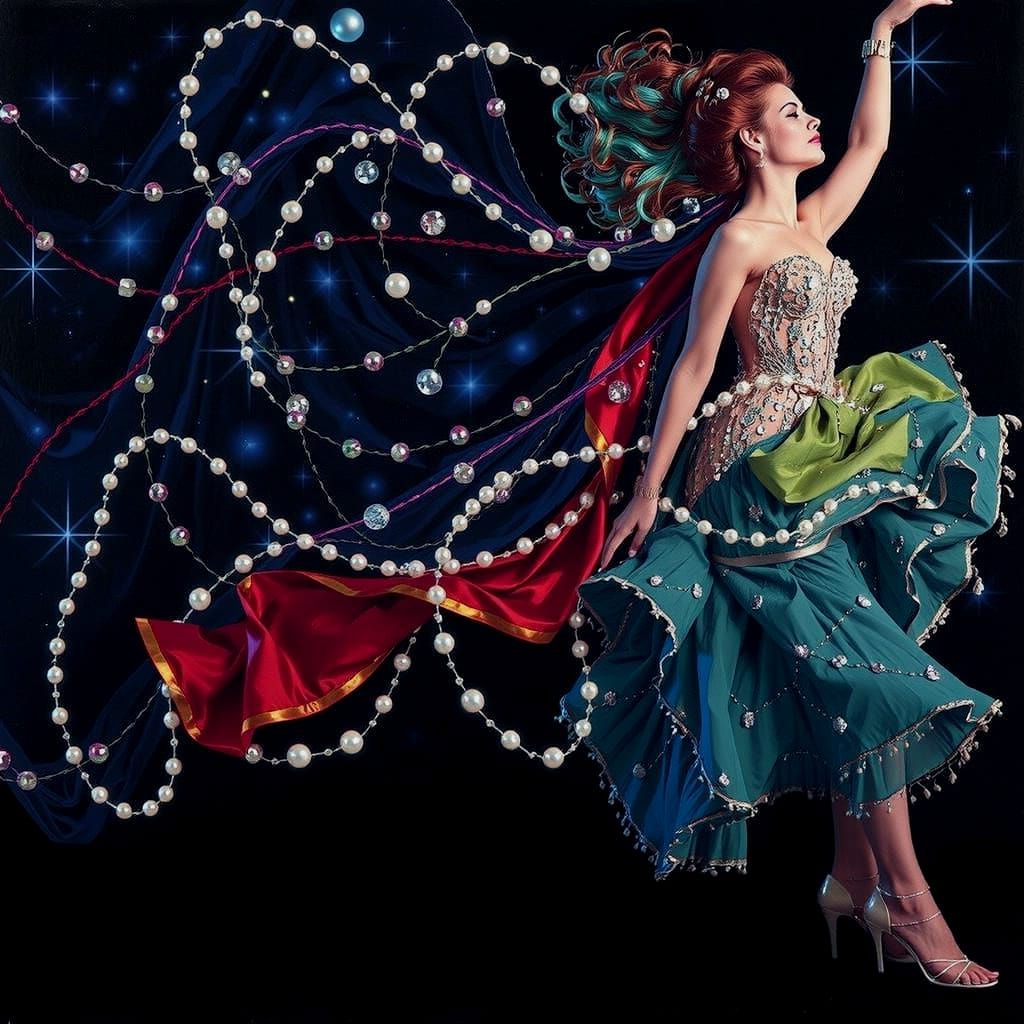 This image shows a glamorous dancer with a vivacious spirit, dressed in exquisite haute-couture and adorned with shimmering jewels in her hair.