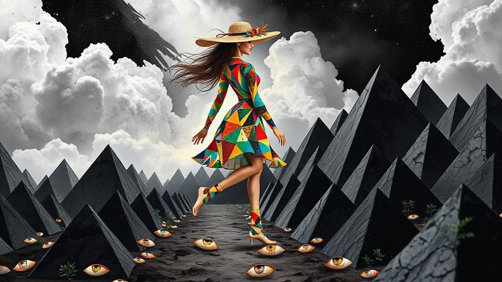 This striking image shows a woman formed from a kaleidoscope of artist's tools, set against a backdrop of black and white pyramids nurturing micro plants, embodying the harmony between nature and art. The piece glows with an ethereal light, blending elements of Bio Art and abstract expressionism.
