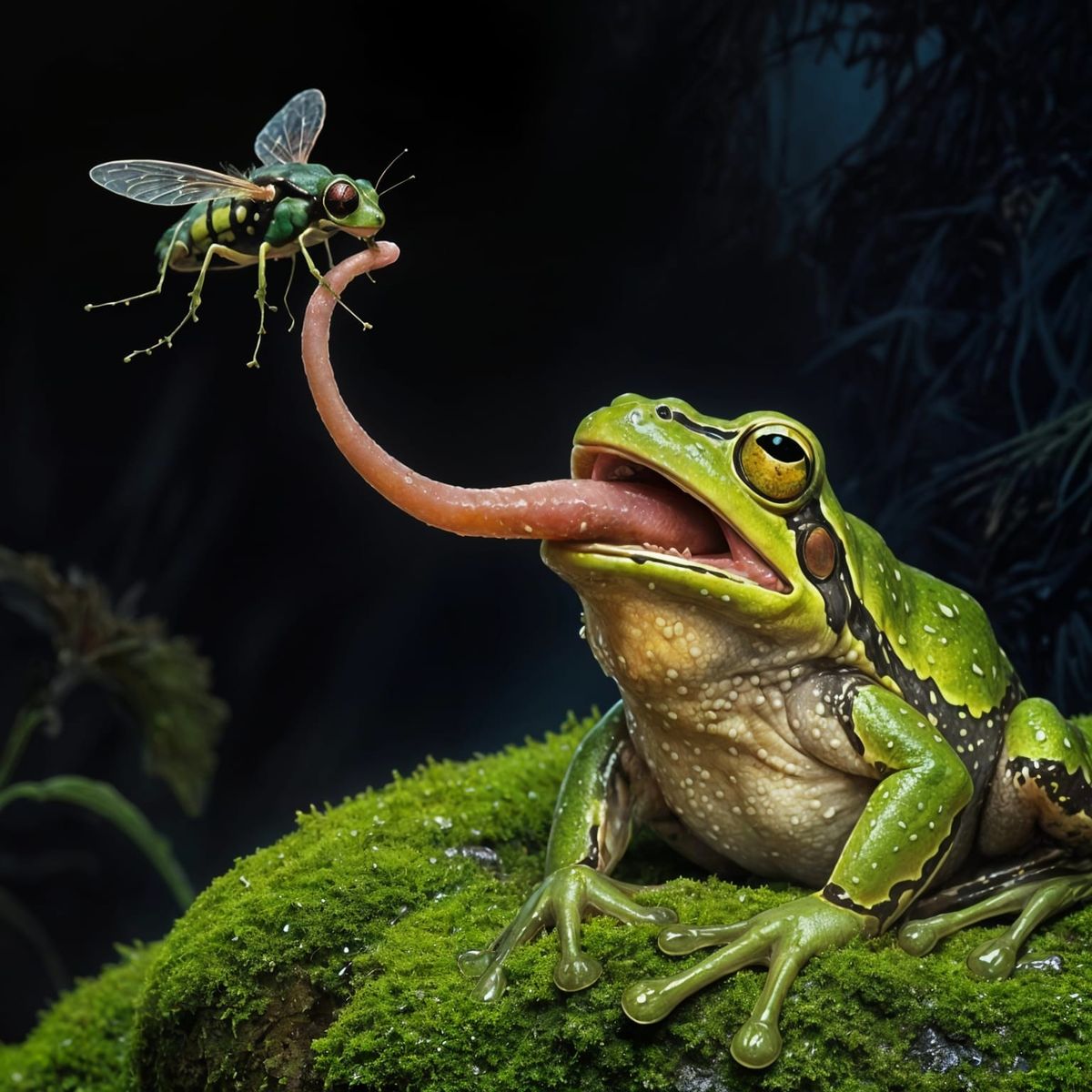 A hyperrealistic wildlife photograph captures a frog's quick tongue snatching a fly mid-air. The image features vibrant, dark colors and stunning 8k detail.