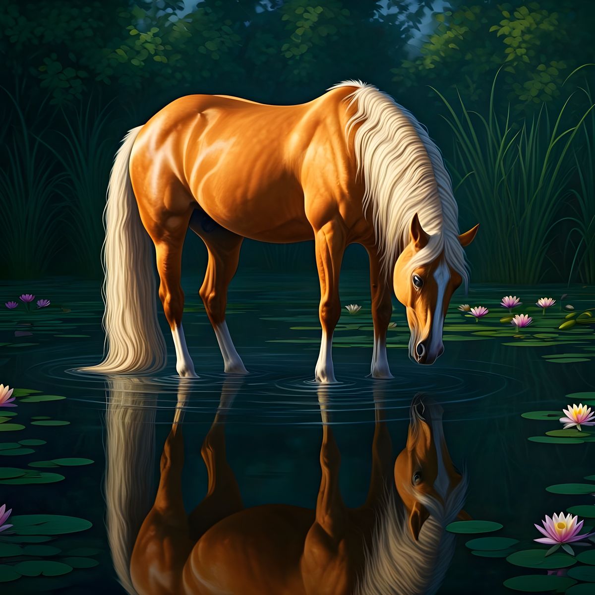 A detailed painting shows the reflection of a palomino horse in a lily pond. The upside-down view captures the horse's golden coat and long, flowing mane.