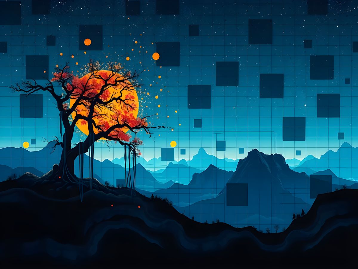 This image depicts a corrupted, evolving natural landscape with multiple layers and disrupted patterns, rendered in shades of Eastern Indigo.