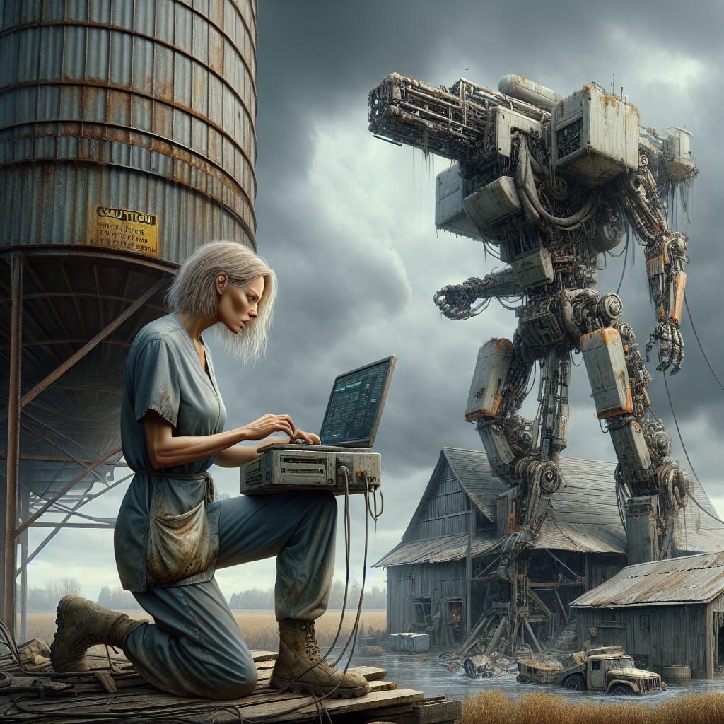 A woman in medical scrubs works outside a dilapidated farmhouse, surrounded by a war-torn robot and a hazardous environment. A boy is seen in the background, amidst a scene of decay and contamination.