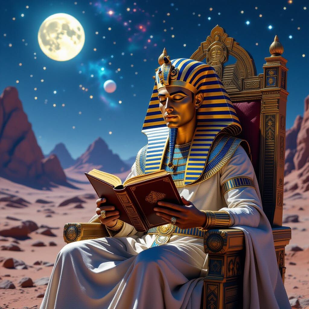 This image shows a human Pharaoh in regal attire on an ornate throne on a desolate alien world, illuminated by celestial light. The scene blends nostalgic sci-fi concept art with cinematic lighting.
