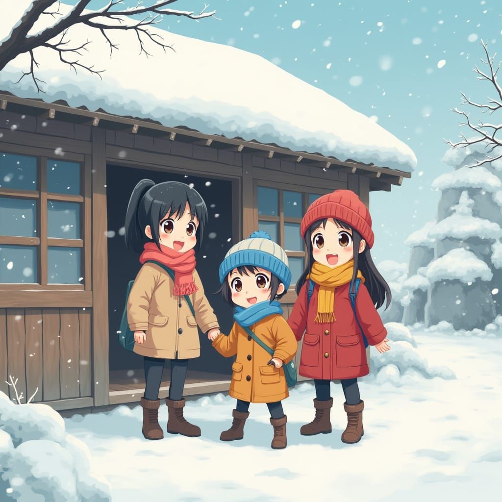 A charming anime-style image of Javanese girls visiting a snow hut with a young boy. The scene is filled with soft snowflakes and joyful energy, reminiscent of anime art.