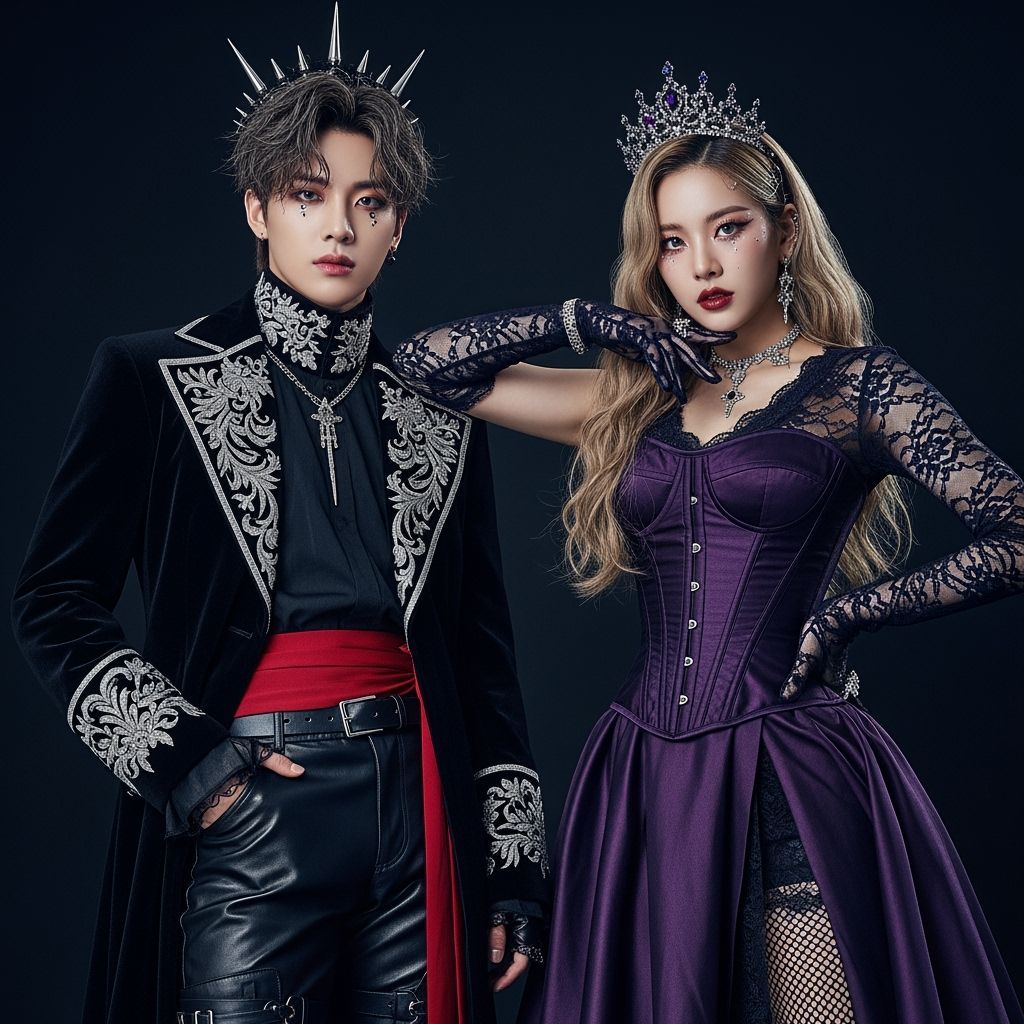 A striking picture of a male and female K-pop duo in dark fantasy attire. The male wears a black velvet coat and the female a purple corset gown, rendered with hyperrealistic detail.