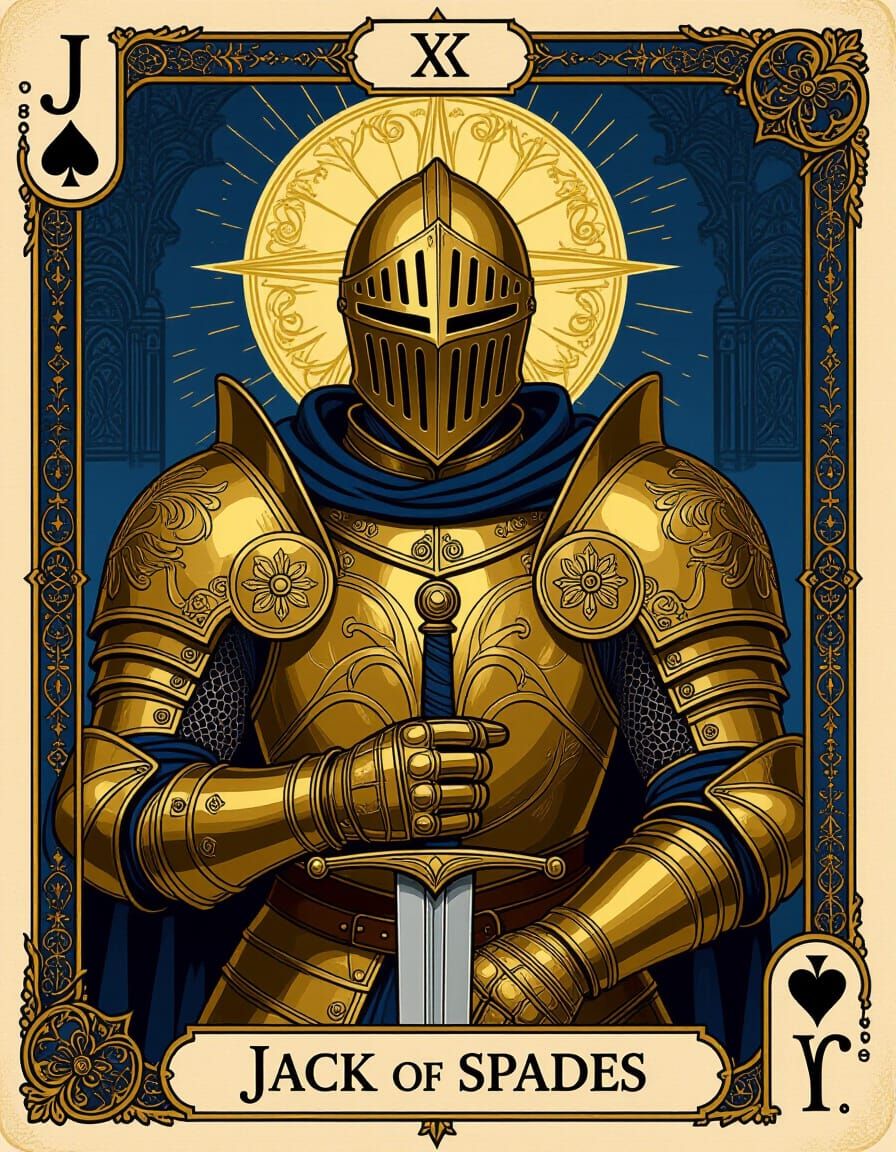 This image depicts the Jack of Spades as a hyperdetailed knight in ornate golden armor, rendered in a gothic, necro, and tarot card style with cinematic blue and gold tones.